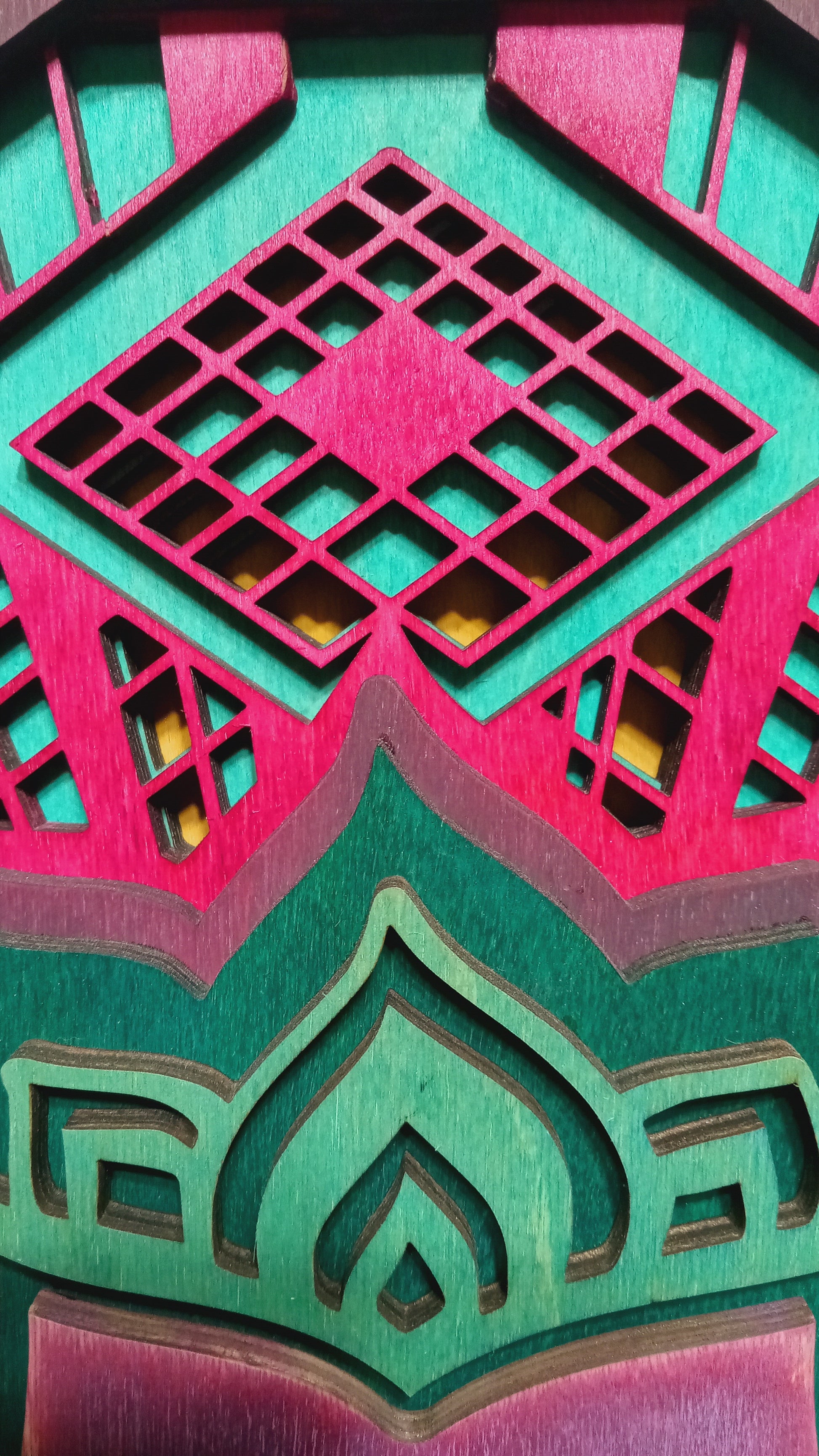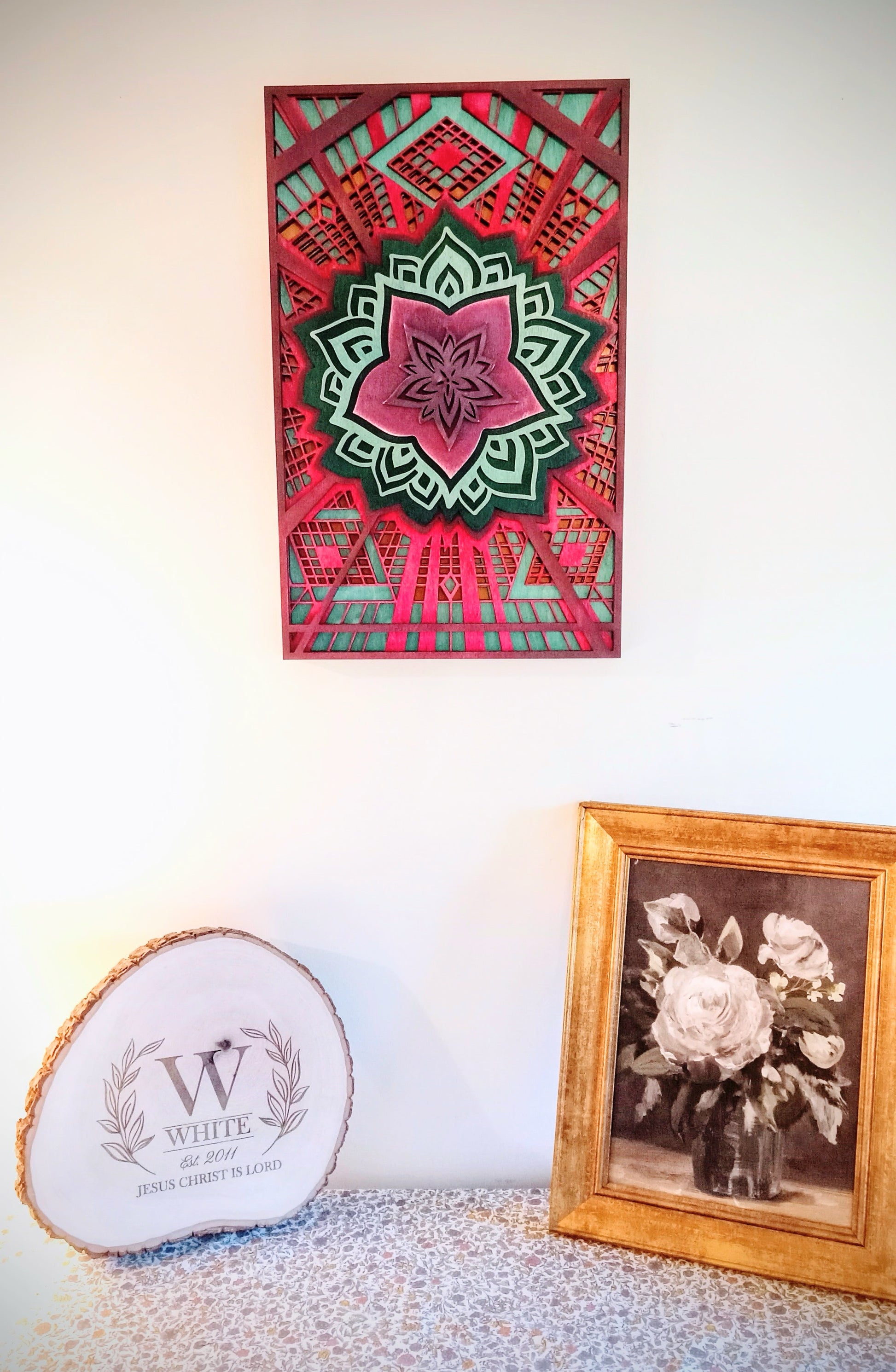 "Floral Dawn" invites calm into your space with its serene wooden relief design. Delicate flower forms emerge from layered wood, while carved rays of light radiate outward, creating a peaceful focal point. Precision-cut forms and hand-finished surfaces create gentle shadow and movement, inviting the eye to slow down.